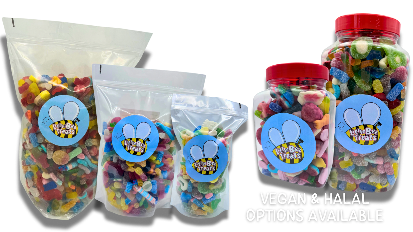 Welcome to Little Bee Treats, your one-stop-shop for all things sweet! We're based in Wolverhampton and we sell the most delicious pick and mix sweet bags online. Our sweets are not just any old treats, but are lovingly crafted with quality and variety in mind. Whether you're after jelly filled or fizzy pick and mix sweets, or simply want to create your own customisable sweet bags, we've got you covered.